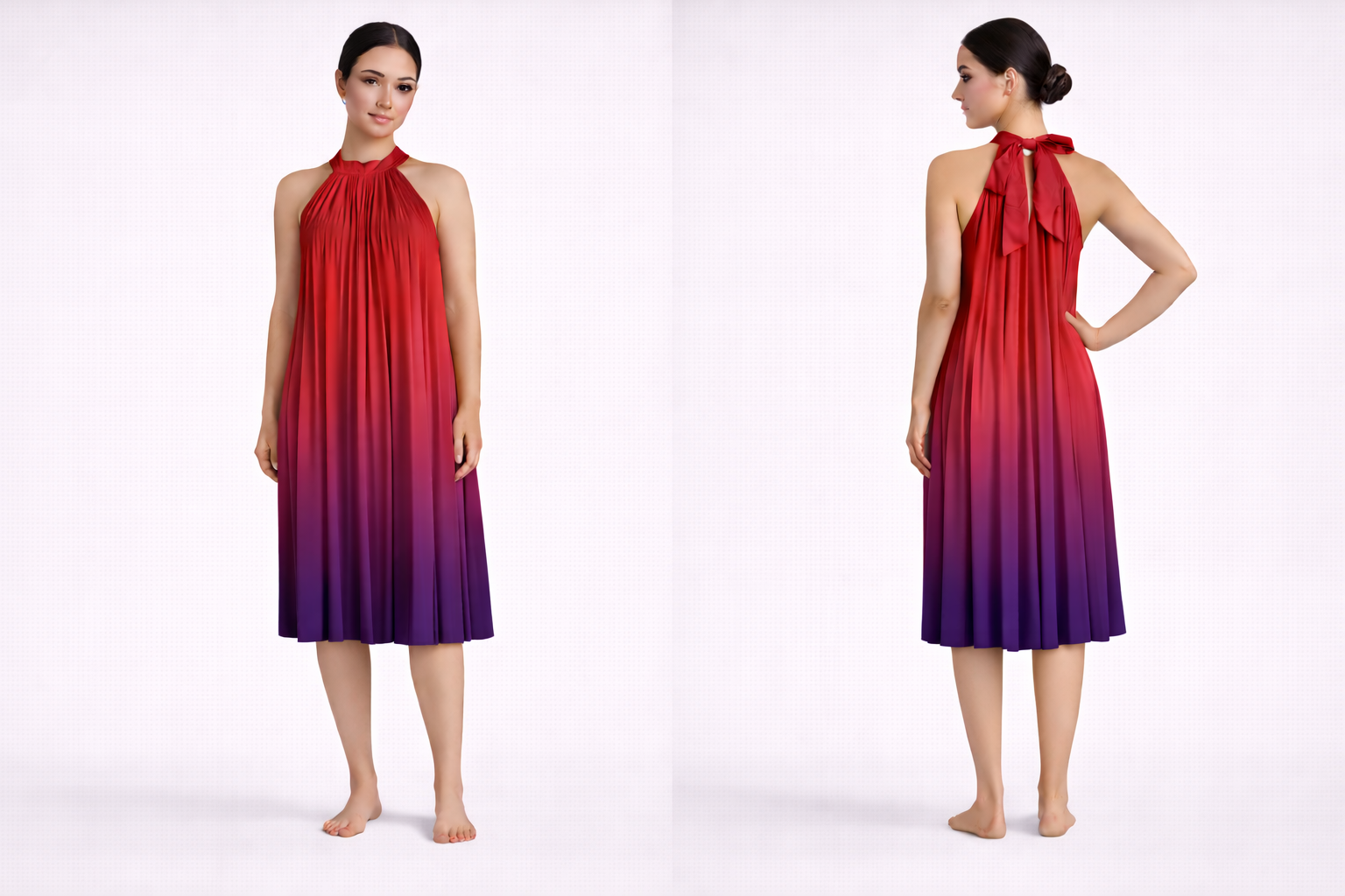 Ethereal and eye-catching, the Aurora Drift Dress is designed to move beautifully with every step. Featuring a striking ombré blend that flows from rich red into deep violet tones, this halter-neck dress is finished with fine pleating that creates soft texture and graceful movement.