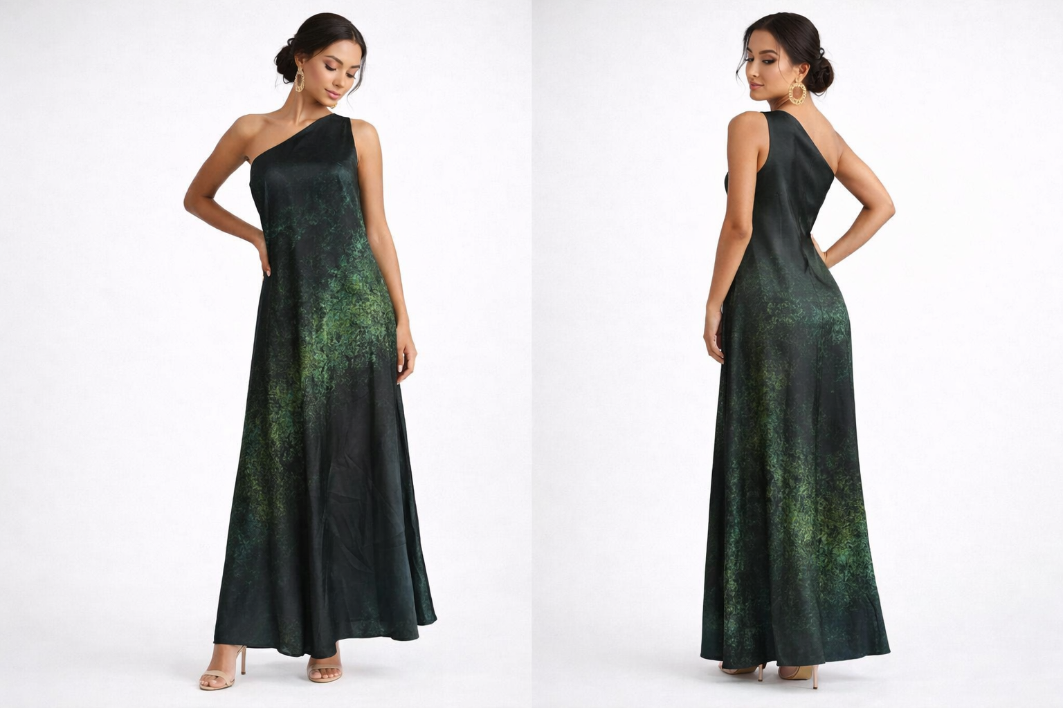 A striking one-shoulder silhouette designed to flow effortlessly with every step. The Emerald Dusk Gown features a deep black base softened by subtle emerald-toned detailing that catches the light just enough to feel special without overpowering. Its fluid drape and floor-length cut create an elongated, graceful look, while the asymmetrical neckline adds a modern edge.