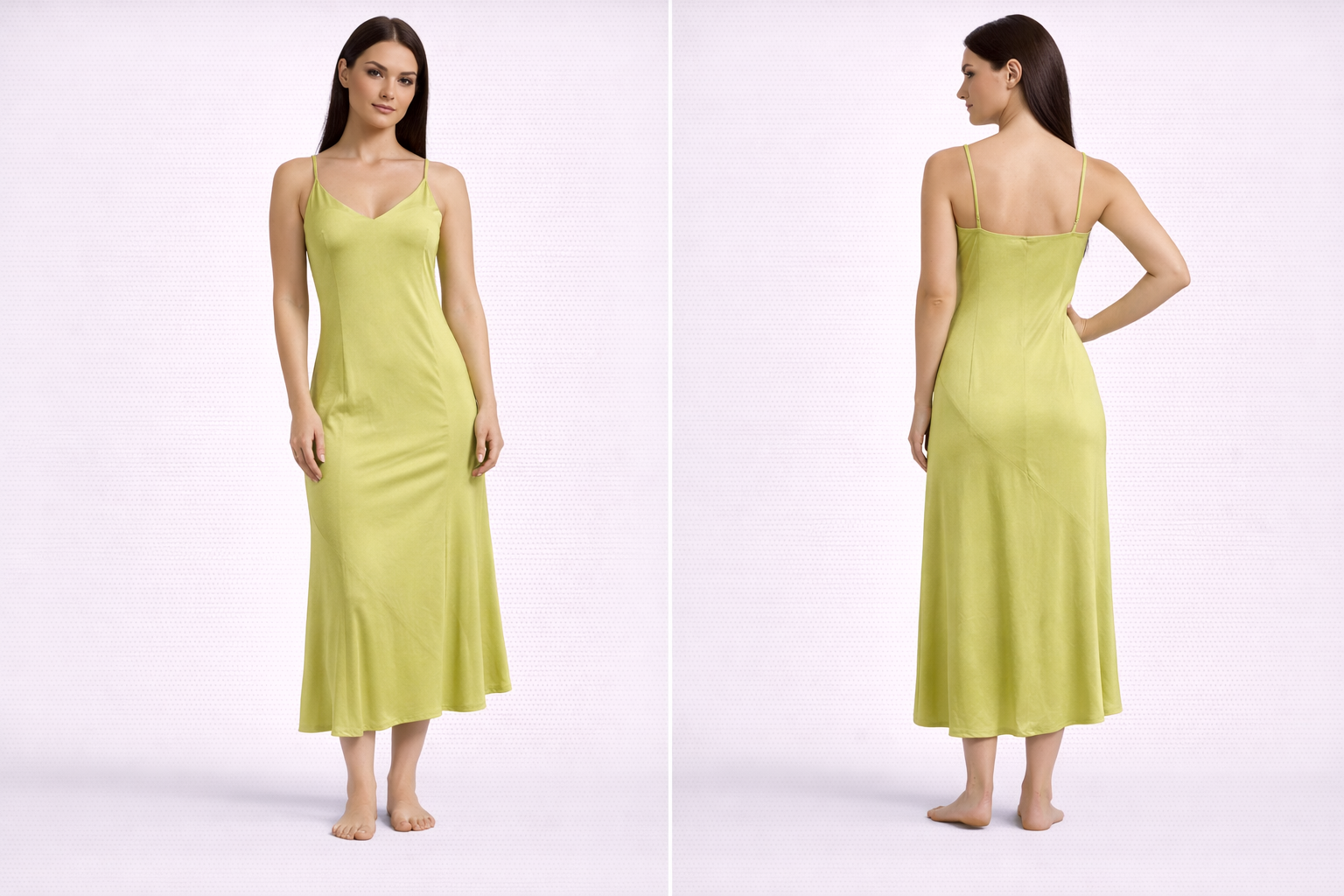 Fresh and effortlessly refined, the Lime Satin Slip Dress features a sleek silhouette that skims the body with ease. Designed with delicate spaghetti straps and a soft V-neckline, it falls into a fluid midi-length skirt that moves beautifully with every step. The subtle diagonal seam adds gentle structure while maintaining a relaxed, modern feel. Minimal yet striking, this dress is perfect for warm-weather occasions where understated elegance stands out.