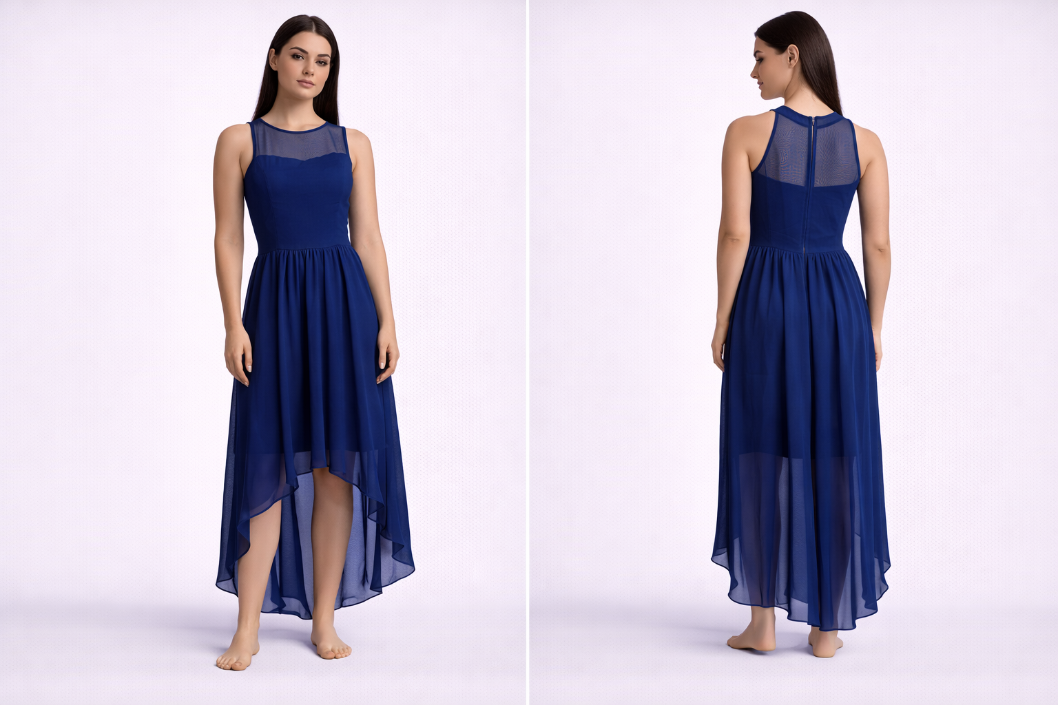 An elegant statement piece crafted in flowing navy chiffon, this dress features a softly structured bodice with a sheer mesh neckline that adds a hint of allure without feeling overdone. The cinched waist flows into a graceful high-low hem, creating beautiful movement with every step, while the sheer back panel adds a subtle, modern edge.