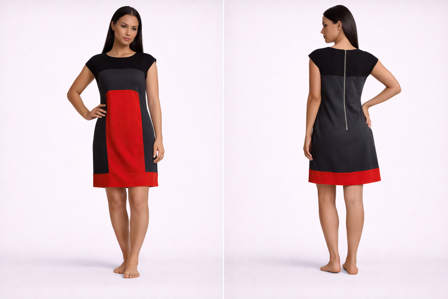 Striking and contemporary, the Scarlet Axis Dress is designed to command attention with clean structure and bold colour blocking. Featuring a vivid red central panel framed by deep charcoal and black tones, this dress creates a sleek, elongating silhouette that flatters the body effortlessly.