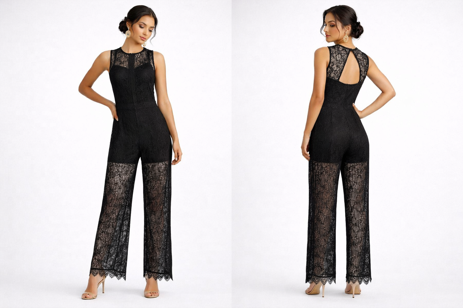 Striking and sophisticated, the Shadow Lace Jumpsuit is designed for nights that call for confidence and drama. Crafted in intricate black lace, this sleeveless jumpsuit features sheer detailing through the legs and upper bodice, balanced by a structured fit through the waist. The open-back design adds a bold, modern touch, while the flared lace trousers […]