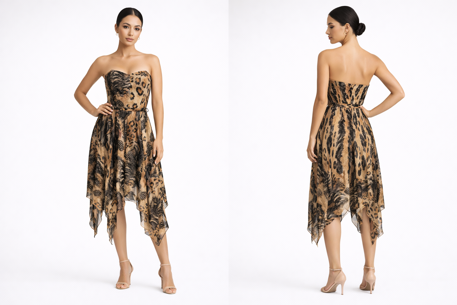 Effortlessly elegant with a playful edge, the Wild Grace Dress features a flattering sweetheart neckline, adjustable straps, and a softly cinched waist that enhances the silhouette. Crafted with a lightweight sheer overlay and an abstract animal-inspired print, this dress moves beautifully while keeping the look refined. The asymmetrical handkerchief hem adds fluidity and visual interest, making it a versatile choice for both day and evening events.